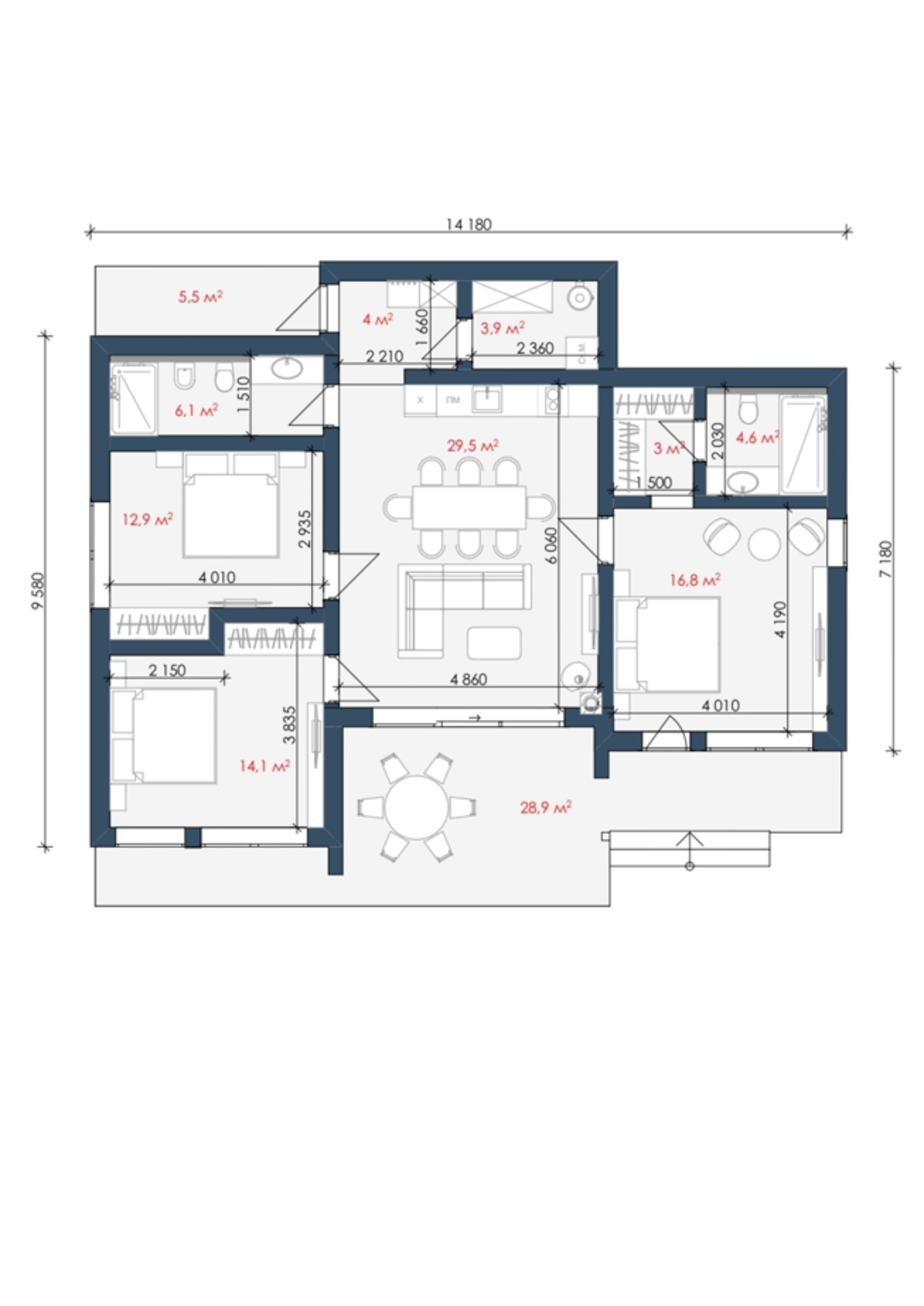 • Кількість житлових кімнат — 3+кухня-вітальня